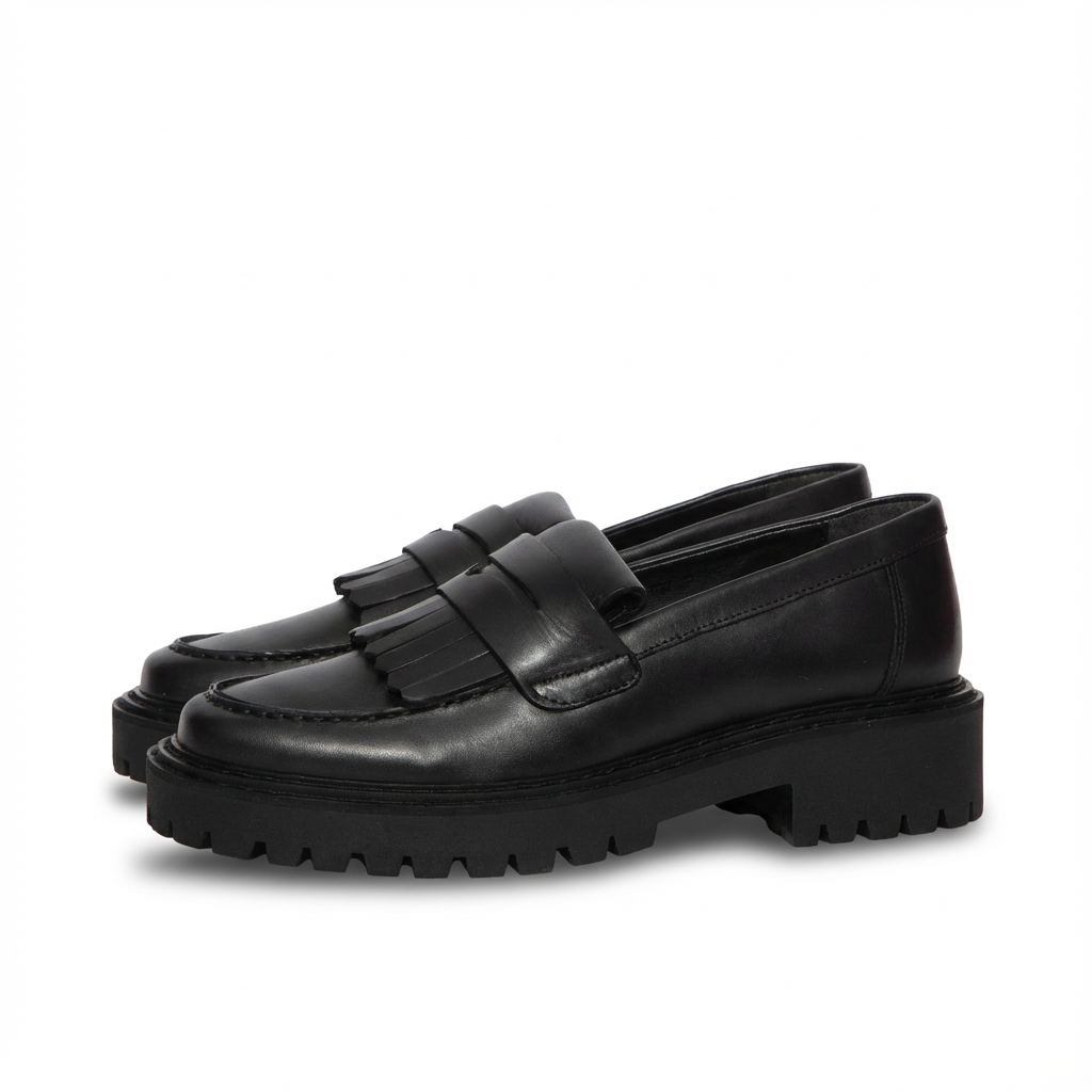 Embrace polished comfort with these stylish IRIS & INK Loafers. Crafted from premium 100% Vacchetta Leather, these slip-on shoes deliver a touch of classic preppy style with a chic, feminine update. The defining fringed kiltie detail adds texture and movement, while the durable rubber nubbed sole provides comfortable traction, making them perfect for city streets or casual office wear. These are the versatile flats that belong in every modern woman's wardrobe. The image shows them in a sleek Black leather finish.