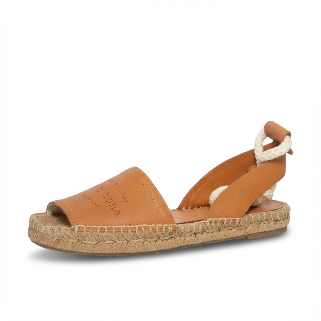 Embrace warm-weather sophistication with these beautiful RAG & BONE Flat Espadrilles. Expertly crafted from premium 100% Vacchetta Leather, these sandals feature a chic open round toe and elegant straps that tie at the ankle, allowing for a custom and stylish fit. The authentic rubber and jute sole is the hallmark of the classic Spanish espadrille, while subtle debossed detailing on the leather adds a touch of designer quality. These imported flats are the perfect blend of casual comfort and luxury vacation style.