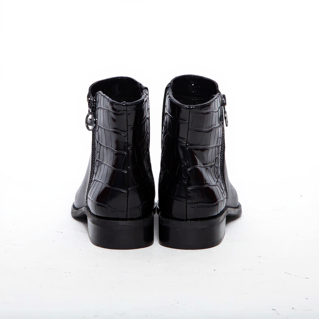 Please note: The images provided show a sleek black boot with a textured, crocodile-embossed panel at the heel. Please review them carefully, as they form a crucial part of the product description.